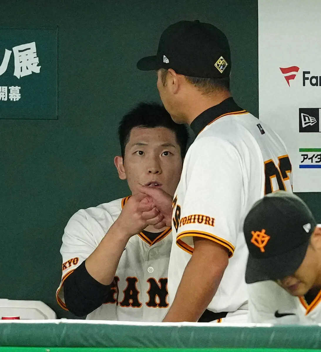 <巨・広10>7回、戸郷(左)に声をかける阿部監督(撮影・島崎忠彦)