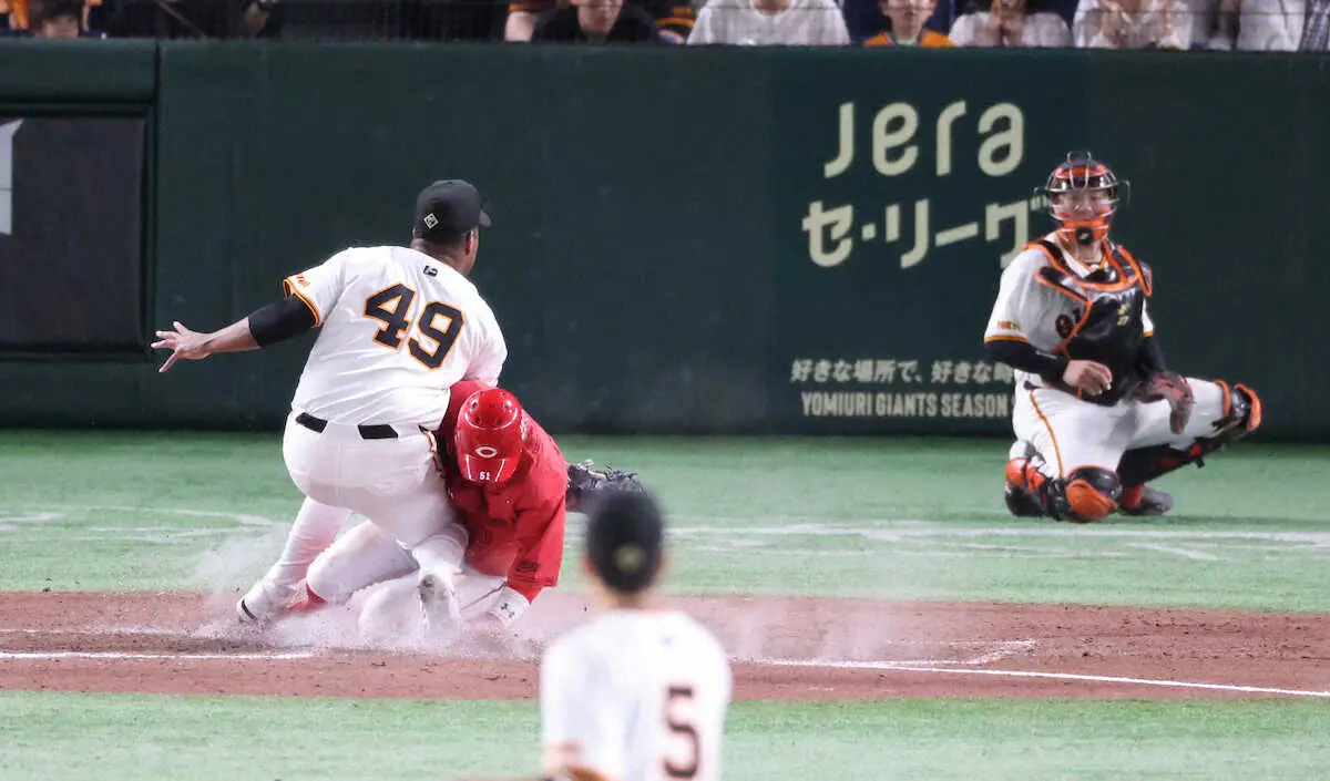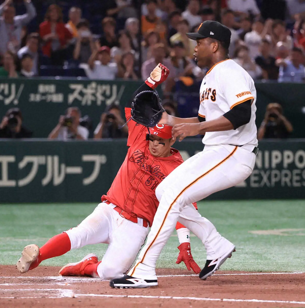 <巨・広(10)>9回、バルドナードの暴投で小園が同点の生還 (撮影・西川祐介)