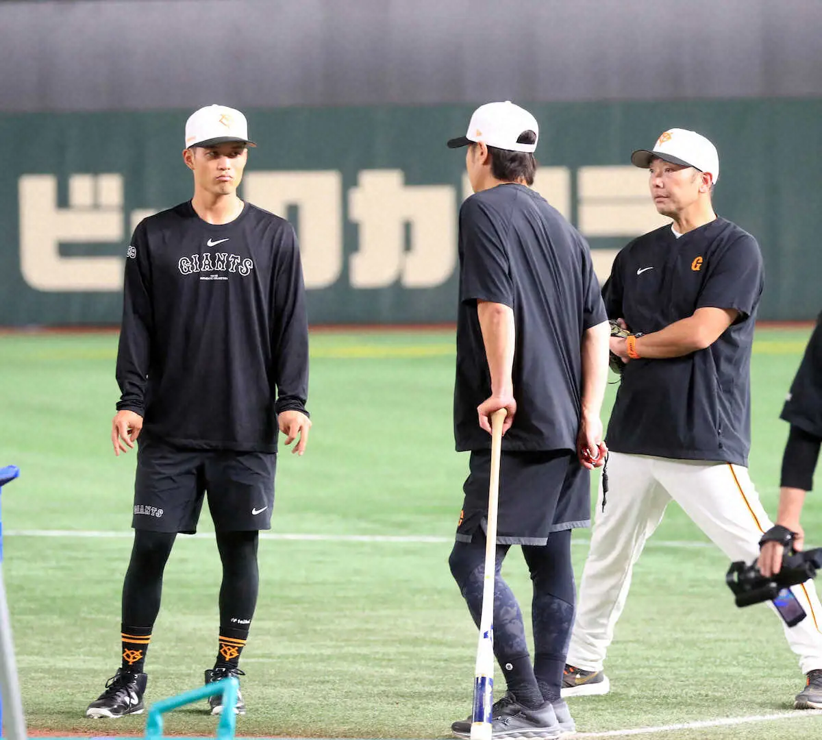 <巨・広>西武から移籍した若林(左)が試合前練習に合流し阿部監督(右端)、亀井外野守備兼走塁コーチと話し込む (撮影・西川祐介)
