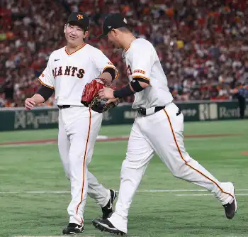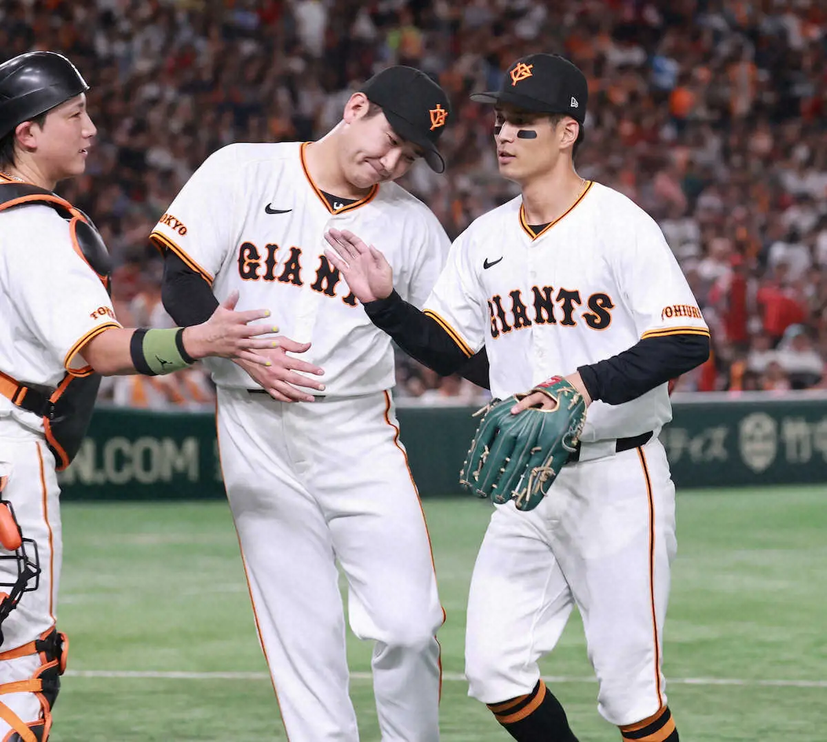 <巨・広12>6回1死1、二塁の場面でベンチから出る阿部監督を見る菅野(左)と小林(撮影・篠原岳夫) Photo by スポニチ 巨人・菅野智之が6勝目「誠司も真っすぐがいいからどんどん真っすぐで攻め… ギャラリーで見る この記事のフォト 2024年06月30日の画像一覧 もっと見る 2024年06月30日の画像をもっと見る
