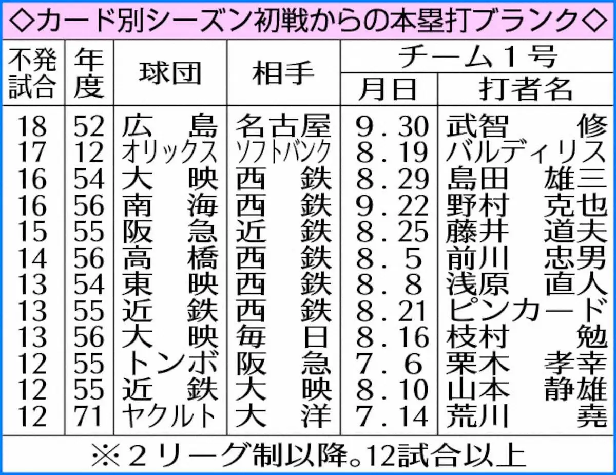 2リーグ制後、カード別でシーズン初戦から11試合以上本塁打なしは、昨年ロッテがオリックス戦で11試合続けて以来。楽天が12試合出ないと12年オリックスのソフトバンク戦17試合以来12年ぶりになってしまう。最長は52年広島の名古屋戦18試合。12試合以上は投高打低時代の50年代に10度あり、60年代以降は2度しかない。56年の南海は西鉄戦で当時パ・ワーストタイとなる開幕から16試合0。チーム1号は9月22日に06~09年に楽天監督を務めた野村克也が放った3ラン。プロ入り初の西鉄戦本塁打だった。