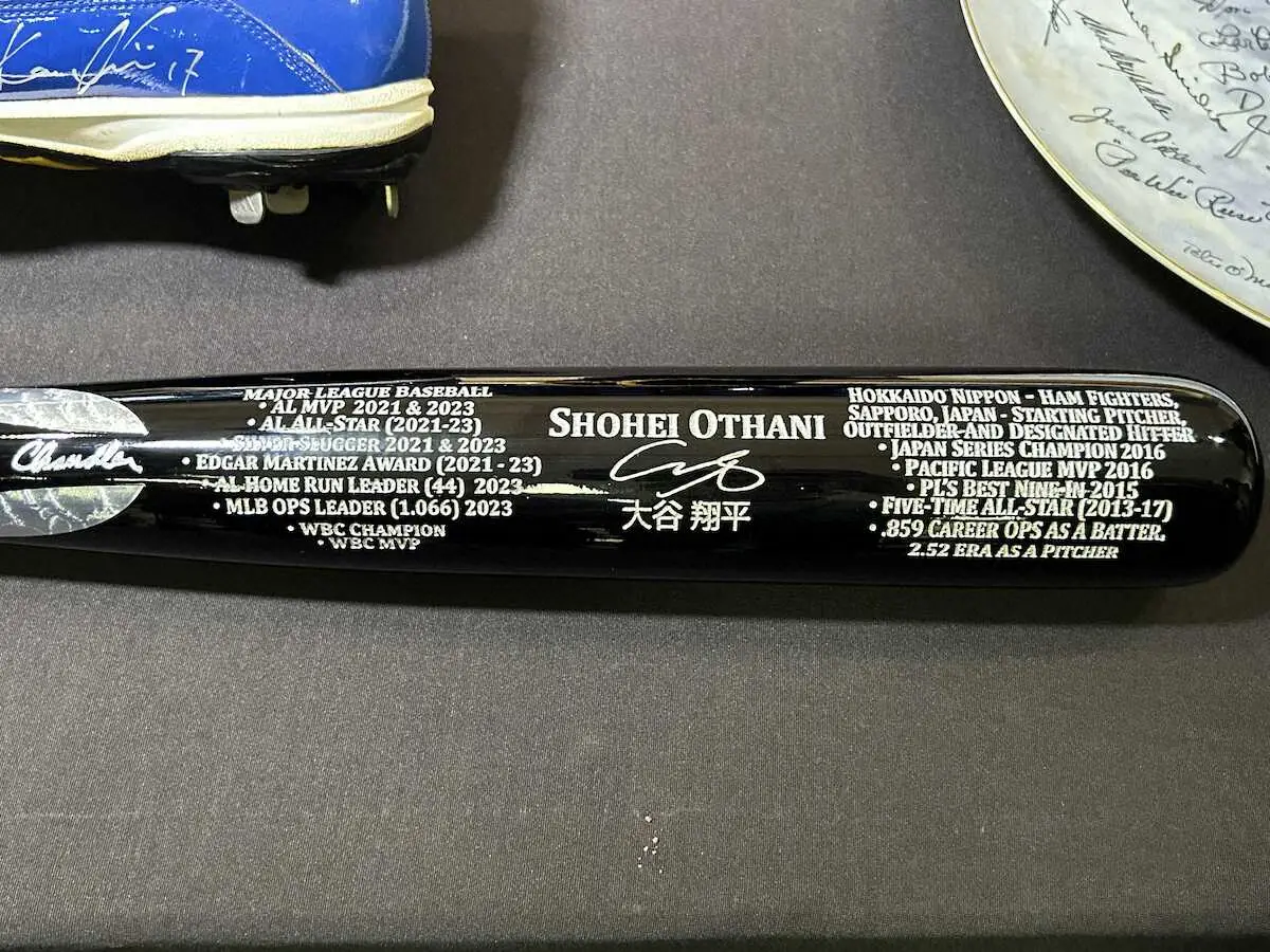 ドジャースの大谷は日本ハム時代を含めた功績が印字されたバットを、米野球殿堂博物館に寄贈し「日本の野球界にとっても大きなこと」と話した。