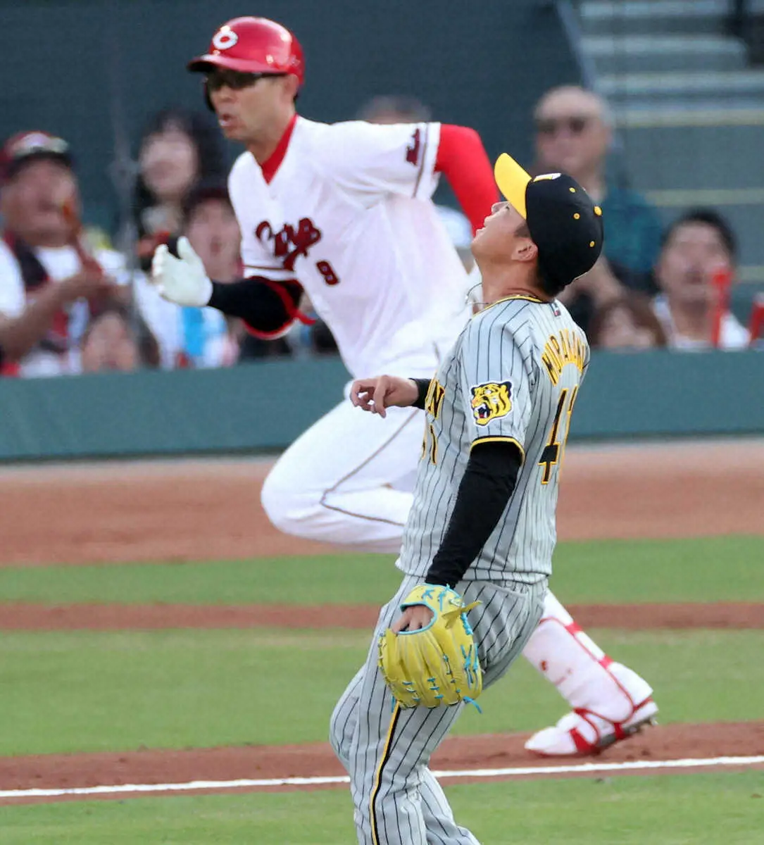<広・神>初回、秋山(奥)に右前打を許して天を仰ぐ村上(撮影・北條 貴史)