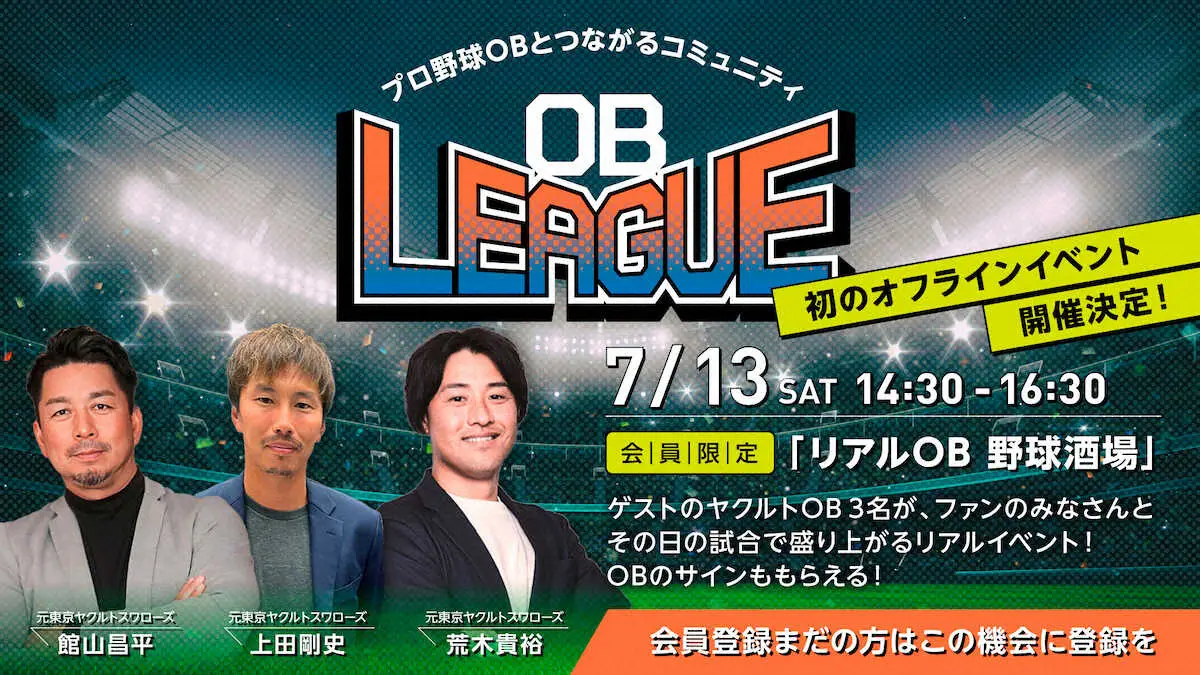 プロ野球OB選手のセカンドキャリアを応援するファンコミュニティ「OB LEAGUE」は、7月13日に渋谷区の会場で、ヤクルトOBの館山昌平氏、荒木貴裕氏、上田剛史氏の3人をゲストに迎え、コミュニティ会員限定のオフラインイベント「リアル OB野球酒場」を開催する。