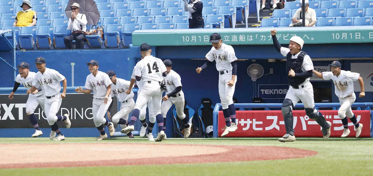 <東京成徳大高・北豊島工科>勝利し、喜びながらベンチを飛び出す大向(右から2人目)ら東京成徳大高ベンチ(撮影・五島 佑一郎)