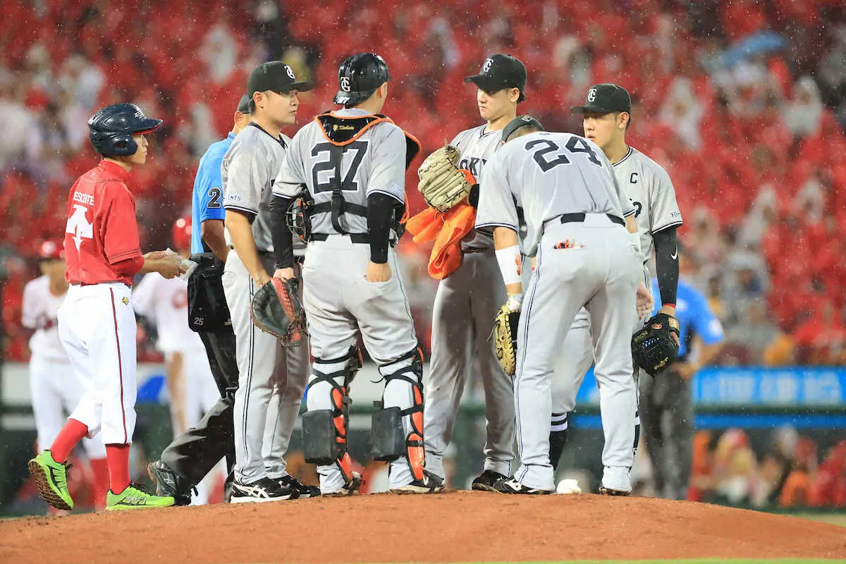 <広・巨(14)>大雨が降る3回、井上(右から3人目)のもとに集まるナイン(撮影・岸 良祐)