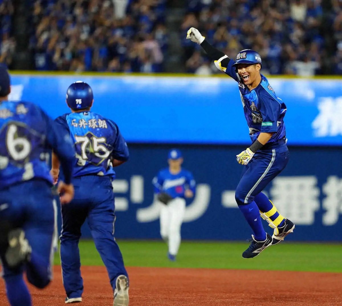 大歓声に迎えられてお立ち台に上がると「プロ初のサヨナラヒットなので。凄くうれしいです」と笑顔。「佐野と戸柱さんがしっかりつないでくれて、何とかバットに当てれば事が起きると食らいついた結果、いいところに落ちてくれた。日頃の行いがいいのかな、と思う」と笑わせた。DeNA移籍2年目で、古巣相手のサヨナラ打。「ベンチを見た瞬間、みんなが笑顔で飛び出してきてくれた。最高でした」と喜んだ。