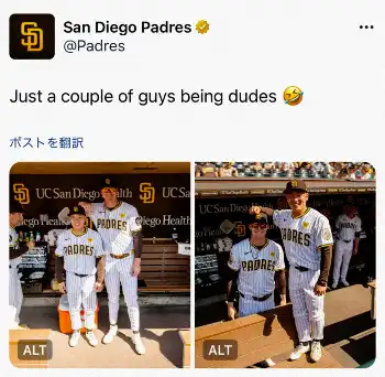 パドレスのXは松井とショーン・レイノルズとみられる右腕の2ショット写真を公開。1枚目は長身のレイノルズが松井の頭に腕を置く写真で、2枚目はダグアウトの外から高低差を利用し、今度は松井がレイノルズの頭に腕を置く写真で、どちらの写真とも2人は満面の笑みを浮かべている。