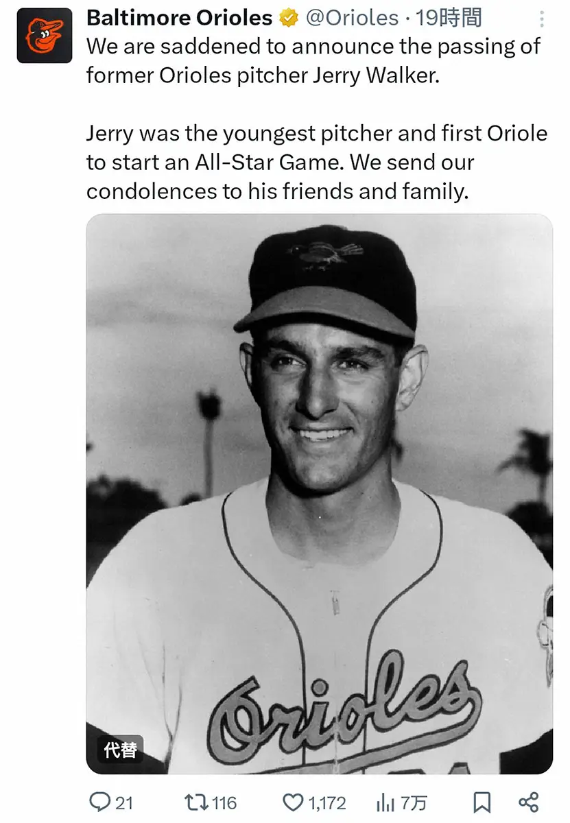 オリオールズなどで通算37勝を挙げたジェリー・ウォーカー氏が、14日に心臓発作で死去したと17日(日本時間18日)、オ軍が発表した。85歳だった。
