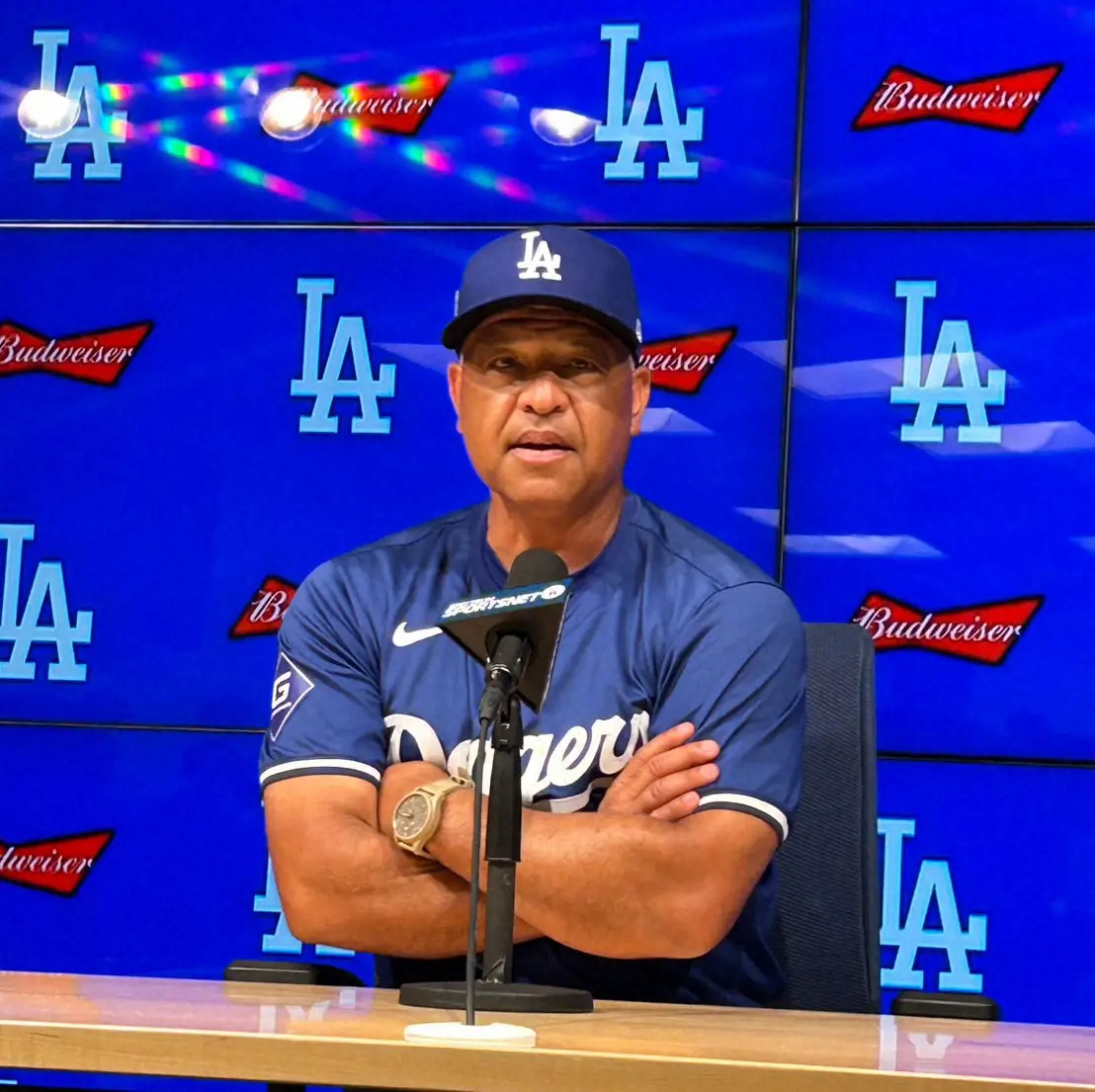 試合前に取材に応じるドジャース・ロバーツ監督(撮影・柳原 直之)