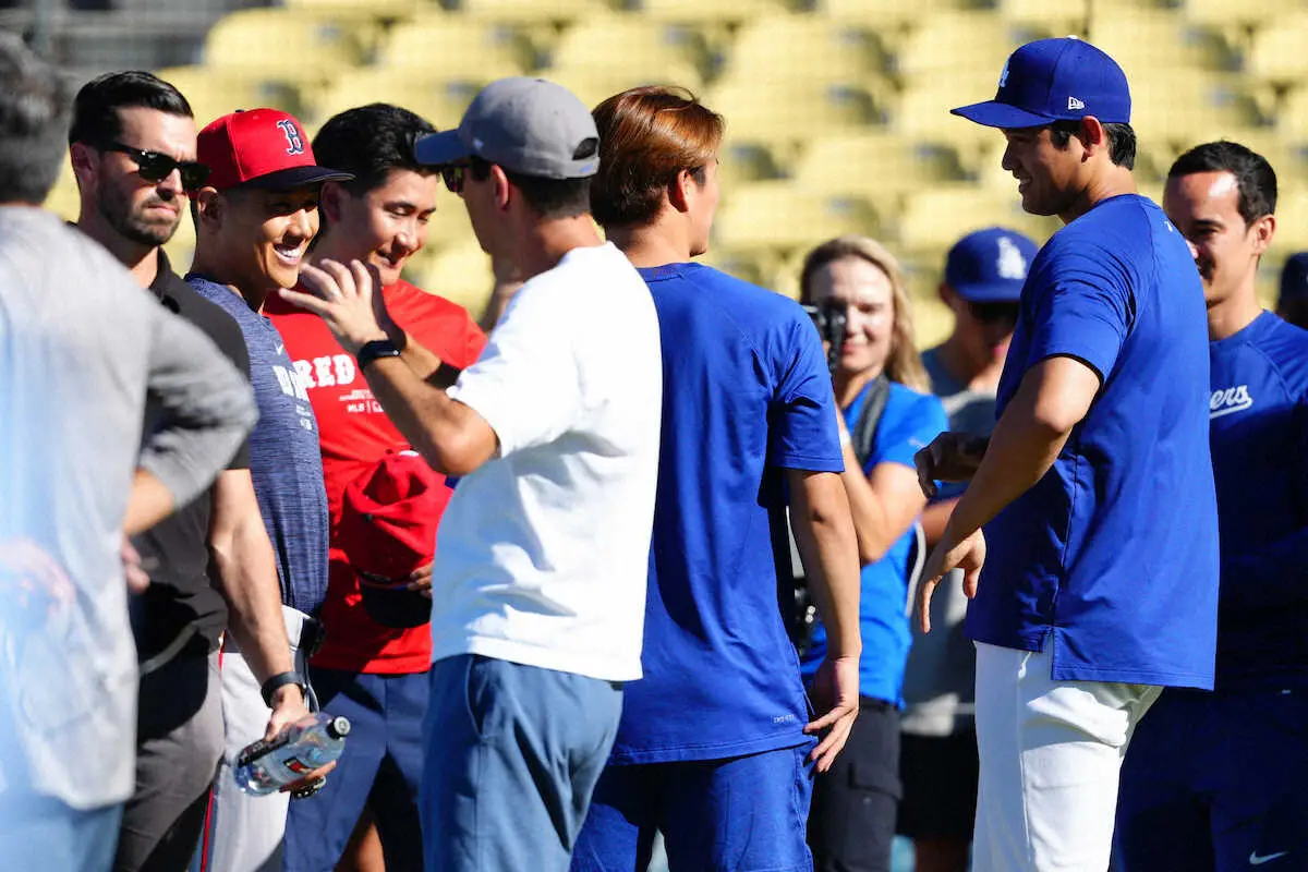 <ドジャース・レッドソックス>試合前、吉田と話す大谷(右)(撮影・西尾 大助)