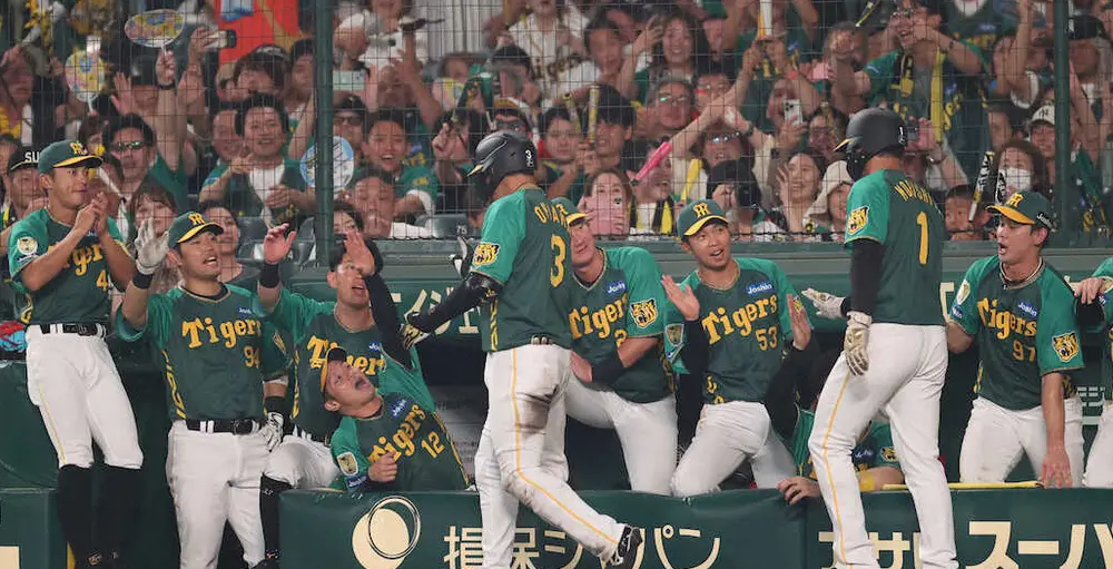 <神・広>6回、2ランを放った大山(中央手前)を迎える阪神ナイン(撮影・北條 貴史)