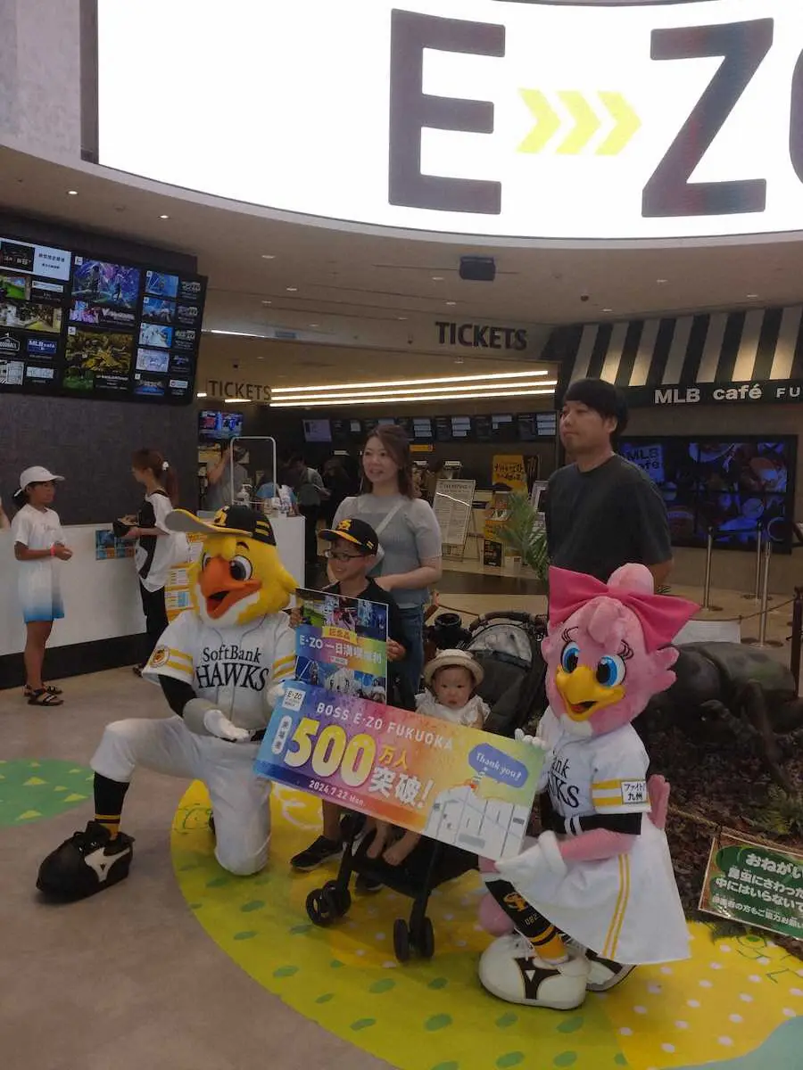 ソフトバンク本拠みずペイD隣接「ボス・イーゾ・フクオカ」来場500万人突破 節目の来場者が熱男ポーズ