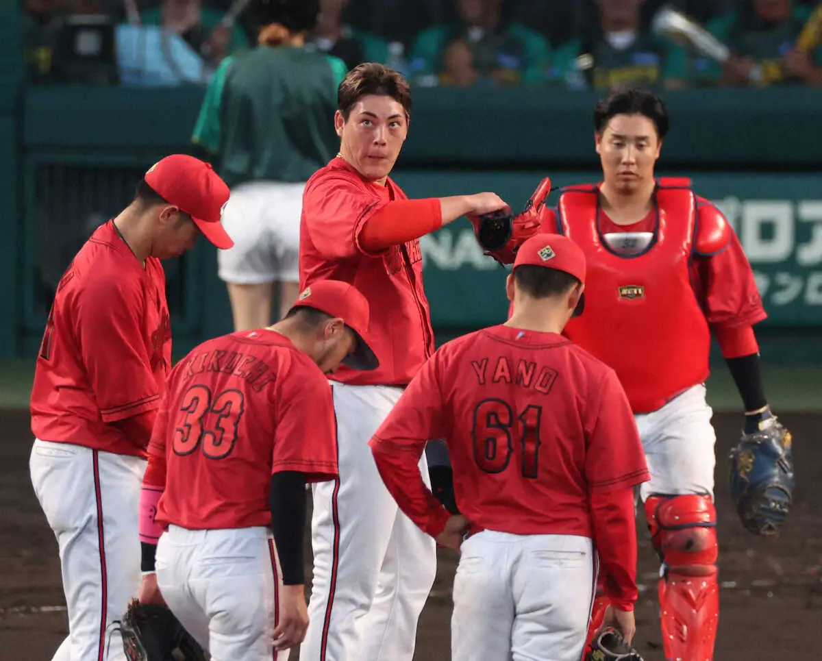 チームは15日DeNA戦の5回から、この日の2回まで35イニング連続無失点を続けていた。だが九里の36イニングぶりの失点から、せきを切ったかのような大量失点が待っていた。2―6の6回から4番手で登板した矢崎も締まらない。1死一、三塁から近本に右前適時打を浴びると、その後も1死満塁から森下の2点二塁打、1死二、三塁から佐藤輝の中犠飛、さらに2死三塁から大山に左越え2ランを被弾。一挙6失点で早々と試合の大勢は決した。