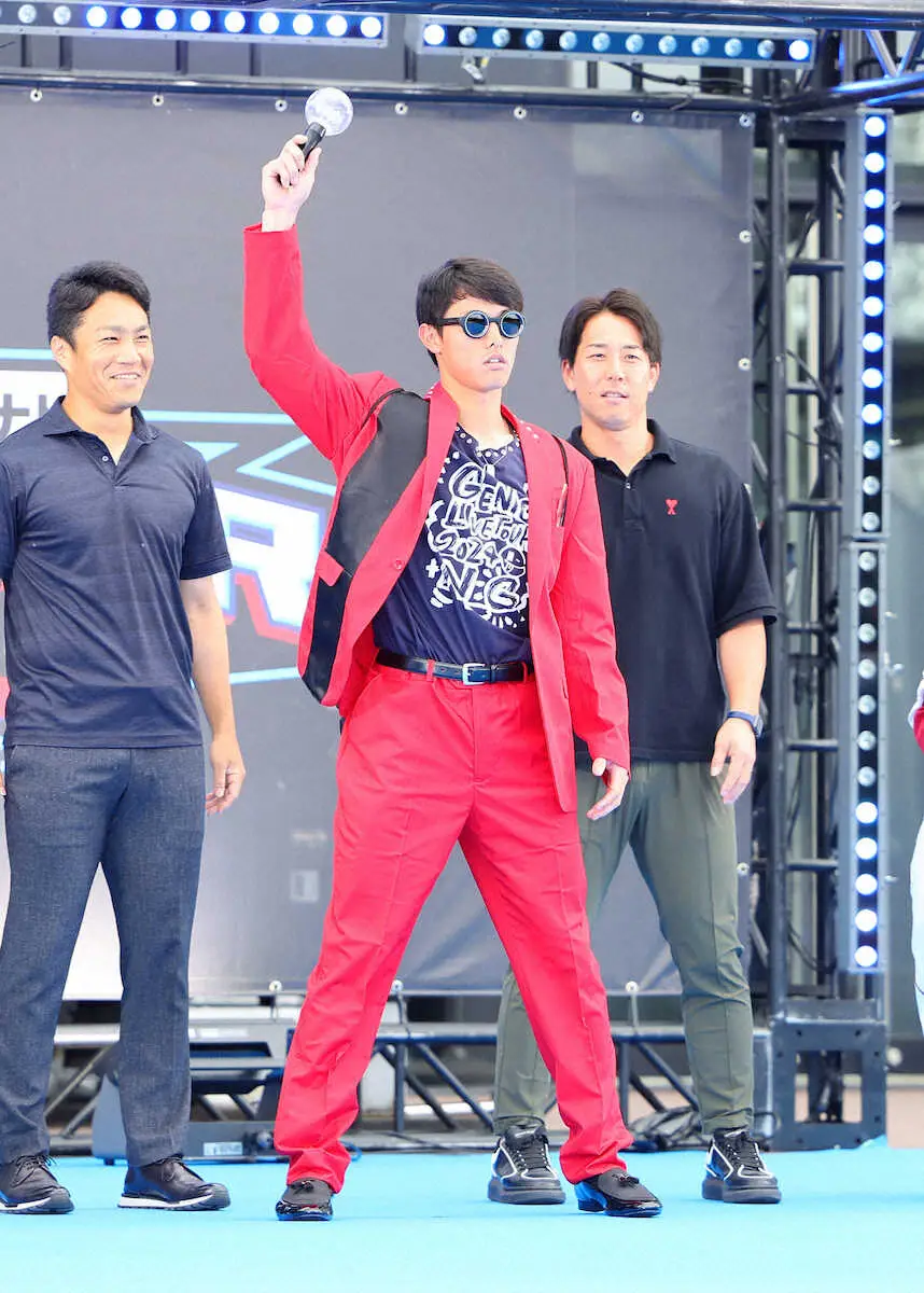 試合前の「ブルーカーペットショー」には、ド派手な赤いスーツで登場。おとなしめの私服が多かった選手の中では異彩を放ち、ファンの度肝を抜くと、試合でも魅せた。7回から中堅の守備につき、初打席は2―11で迎えた8回一、二塁。長尺バットを極端に短く持ち、兵庫・社高の先輩である阪神・近本光司外野手(29)を真似したフォームで広島・栗林良吏投手(28)が投じた2球目を右前へはじき返した。