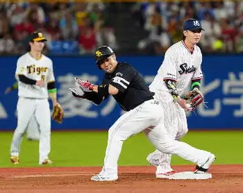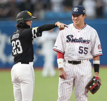 【球宴】ソフトバンク・周東とヤクルト・村上が塁上で“イチャイチャ” 「かわええ」「たまらん」の声
