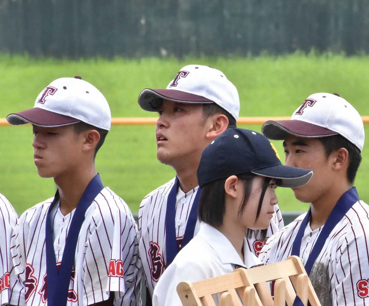 <有田工―鳥栖工>閉会式でメダルをかける鳥栖工の2年生エース・松延(中央)