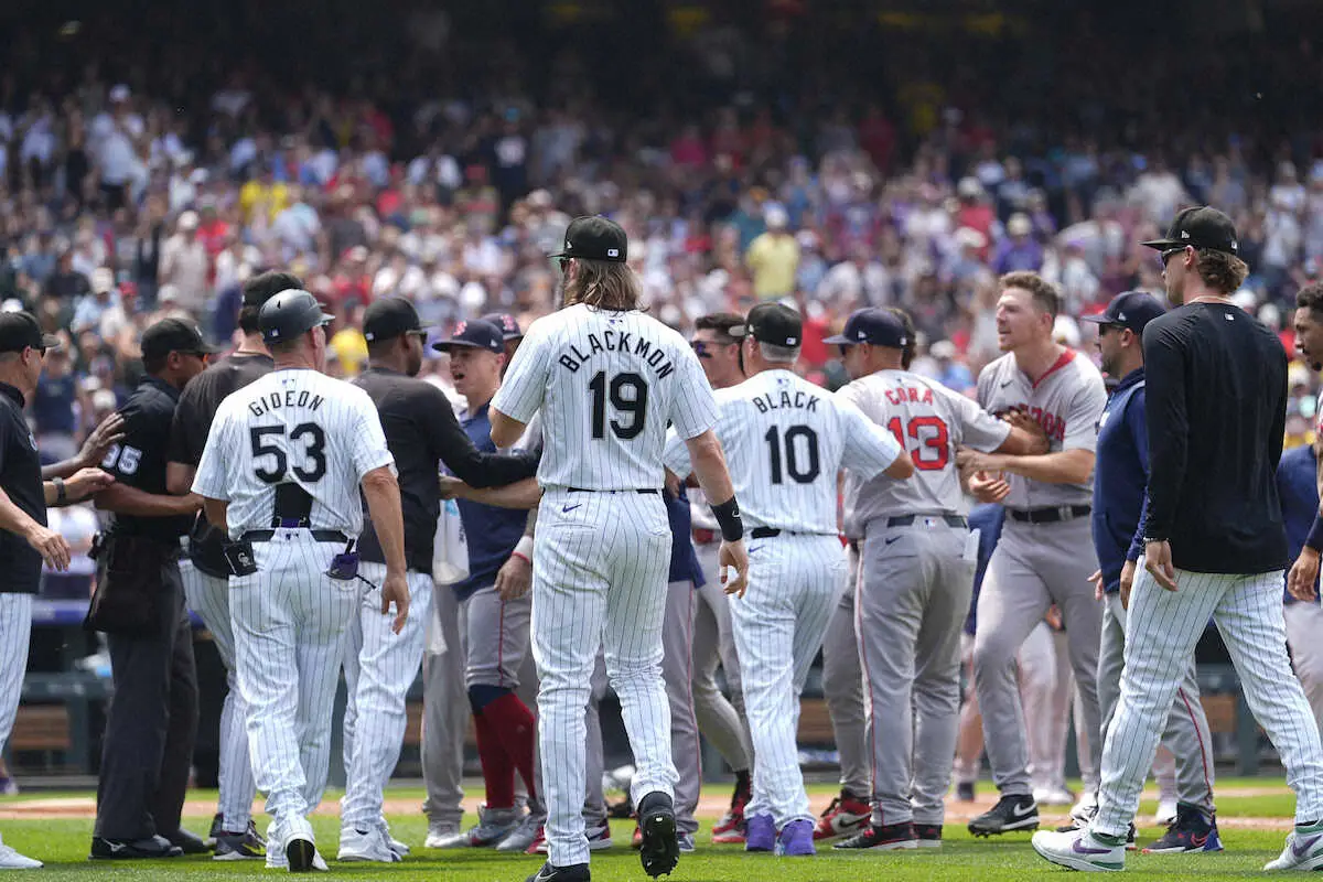 4回に乱闘騒ぎが勃発。先発クワントリル(左じゃら2人目)を守ろうと割って入ったロッキーズのスターリングス捕手(同3人目)がレッドソックス・マグワイア(同4人目)ともみ合いになった Photo by AP レッドソックス吉田正尚は今季10度目の欠場 乱闘騒ぎも勃発する展開の末… ギャラリーで見る この記事のフォト 2024年07月25日の画像一覧 もっと見る 2024年07月25日の画像をもっと見る