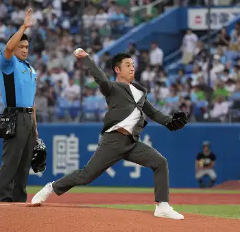 なかやまきんに君がスーツ姿で始球式 ワンバウンド投球に「僕の唯一の武器の筋肉が見えてないから」