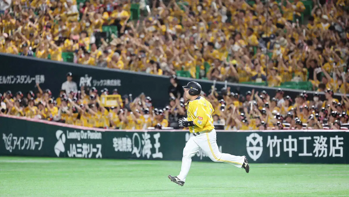 <ソ・オ>初回、先制2ランを放ち、黄色に染まるスタンドを横目にダイヤモンドを1周する山川(撮影・成瀬 徹)