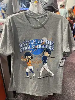 ≪大谷×アストロズアルテューベ 特製コラボTシャツ販売≫大谷とアストロズのアルテューベのコラボグッズが販売された。ア軍の本拠ミニッツメイド・パークでは「スタースラッガー対決」と題し、2人が並ぶ特製Tシャツ2種類=写真、ペナントなどを用意。ア軍が敵チームの選手とのグッズを出すのは初の試みだという。売れ行きは好調で、店員は「次回もこの企画は続けられる」と手応えを口にしていた。