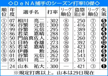 DeNA捕手のシーズン打率10傑 Photo by スポニチ DeNA・山本 96年谷繁以来の球団「打率3割&盗塁阻止率1位」なるか ギャラリーで見る この記事のフォト 2024年07月30日の画像一覧 もっと見る 2024年07月30日の画像をもっと見る