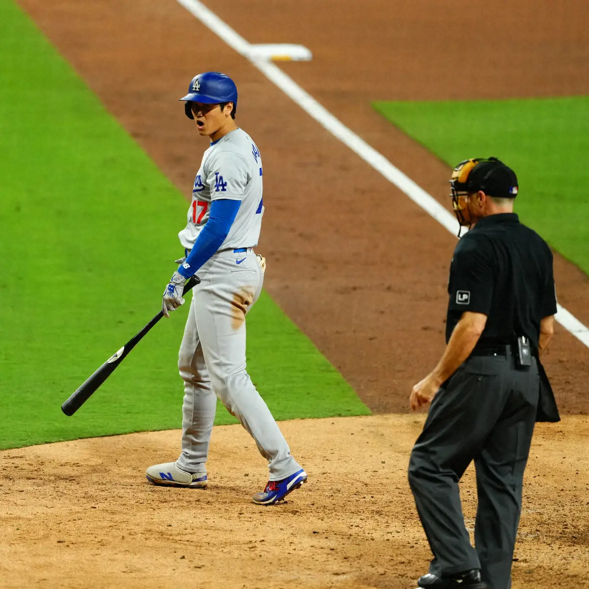 9回1死走者なしで迎えた第5打席は右腕エストラダとの対戦。フルカウントから6球目の低めのスプリットは自身を持って見逃し、一塁に歩こうとしたがストライクの判定。中継のストライクゾーン表示ではストライクゾーンの下限をかすめていたが、大谷は思わず声を上げ、何度も首を振って不満げにベンチに戻った。