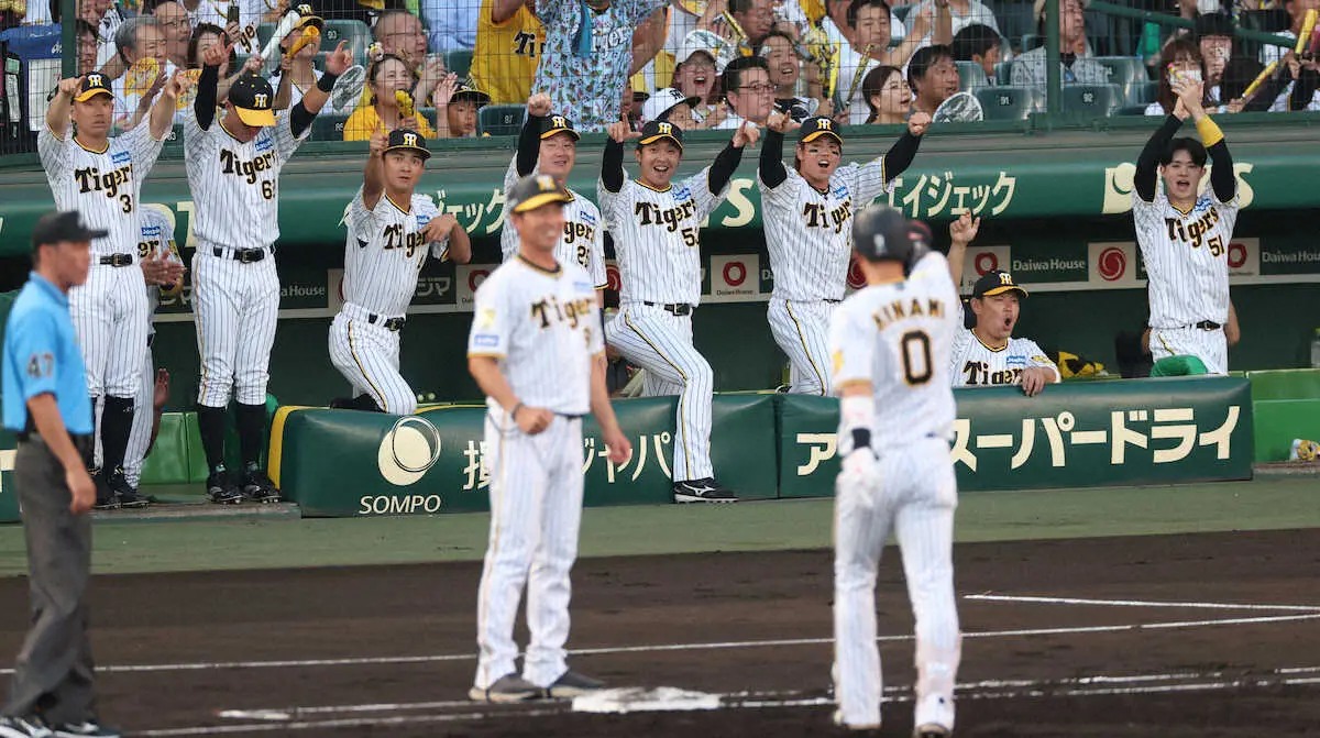<神・巨>初回、木浪の2点適時打に盛り上がる阪神ベンチ(撮影・北條 貴史)