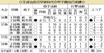 ▽血染めの完投 早実2年だった1957年春の選抜は準決勝まで3試合連続で完封勝利を飾って決勝に進出。高知商との決勝では8回に3点を失って4試合連続完封は逃したが、3失点完投で5―3で勝利。試合途中で左手の中指と人さし指のマメがつぶれて流血したが、気迫で最後までマウンドに立ち続け、伝説の試合となった。