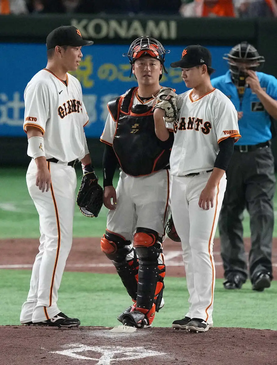 <巨・ヤ>5回、オスナに適時打を許した井上(右)は阿部監督から降板を告げられる (撮影・西川祐介) Photo by スポニチ 巨人・井上温大「反省しています」 勝利投手の権利まであと1死、1点差に… ギャラリーで見る この記事のフォト 2024年08月03日の画像一覧 もっと見る 2024年08月03日の画像をもっと見る