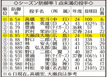 ≪シーズンの規定投球回143まで残り43イニング≫高橋宏(中)は7回を投げて規定投球回に到達し、防御率0.54でセの1位に登場した。現状ではシーズン防御率のプロ野球記録として残る43年藤本英雄(巨)の0.73を超える。ただし、7日に試合を消化すれば、チーム101試合目となり規定未満で一時的にランキングからは消える。シーズンの規定投球回143まで残り43イニングで、この間を自責点9なら0.94で1点未満をキープ。自責点5なら、0.69で藤本を抜いて歴代トップとなる。