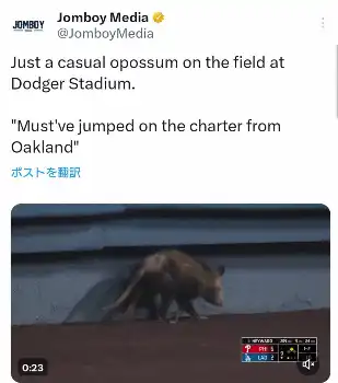 ドジャース戦の試合中にポッサムが出現した動画を投稿した米メディア「ジョンボイ・メディア」の公式X(@JomboyMedia)より Photo by スポニチ ドジャース戦の9回に珍客出現 大谷翔平の元同僚マーシュの後方でウロウロ… ギャラリーで見る この記事のフォト 2024年08月07日の画像一覧 もっと見る 2024年08月07日の画像をもっと見る