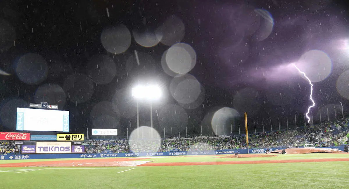 <ヤ・神>5回裏、球場周辺に雷雲が接近したため試合が中断となる(撮影・北條 貴史) Photo by スポニチ ヤクルト―阪神戦は雷雲接近のため一時中断 降雨に加え、稲光が… ギャラリーで見る この記事のフォト 2024年08月07日の画像一覧 もっと見る 2024年08月07日の画像をもっと見る