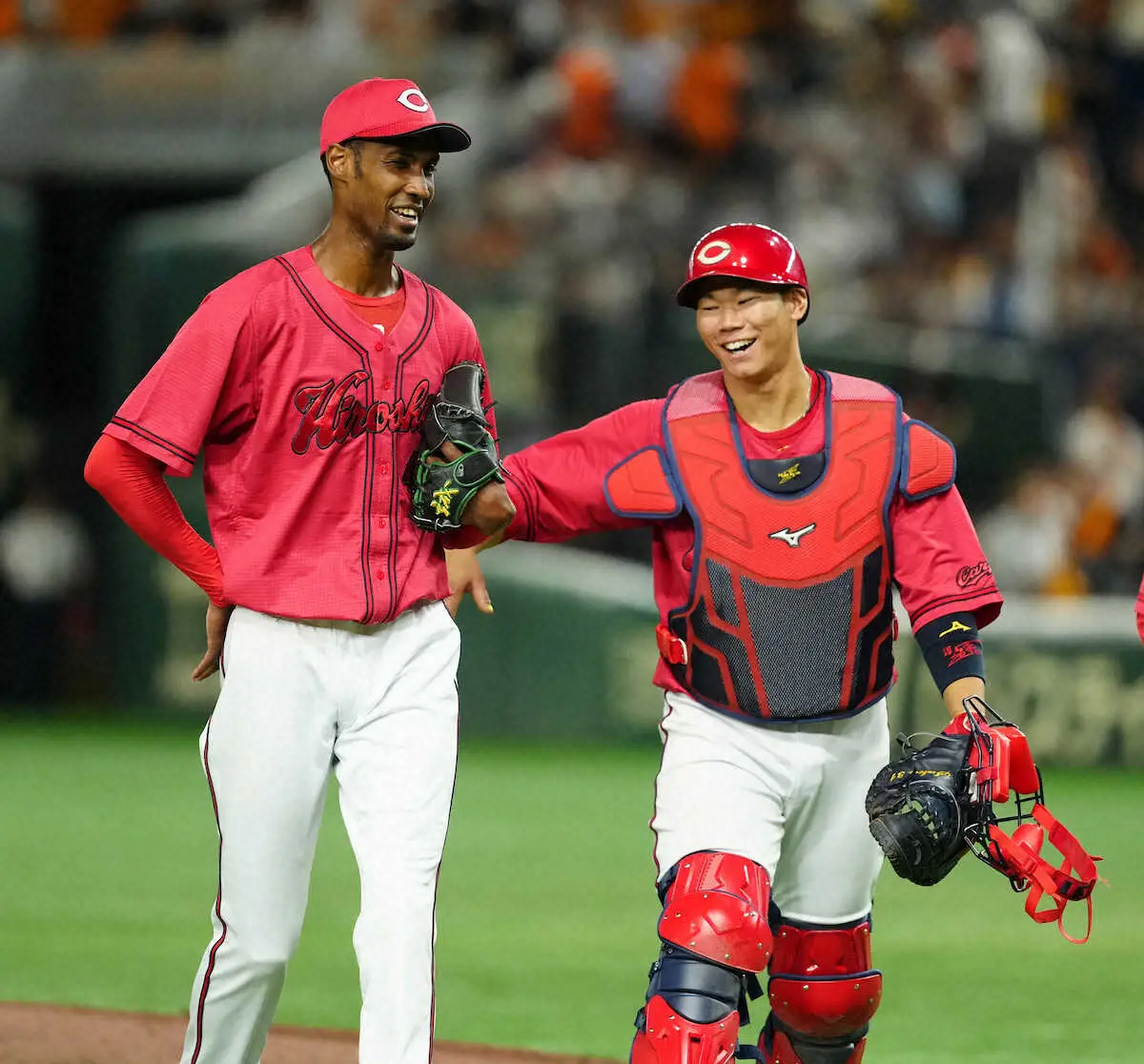 <巨・広>完封勝利し笑顔のアドゥワ(左)と坂倉(撮影・島崎 忠彦)