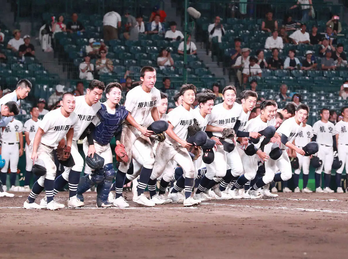半世紀以上遠ざかった夏の甲子園勝利が決まると、地鳴りのような歓声が掛川西ナインを包んだ。64年に延長18回再試合の末に八代東(熊本)を倒して以来の白星。60年前と同じ8月10日に校歌を響かせると、大石卓哉監督は「アルプススタンドに選手が駆け出すと本当に凄いなと」と声を震わせた。