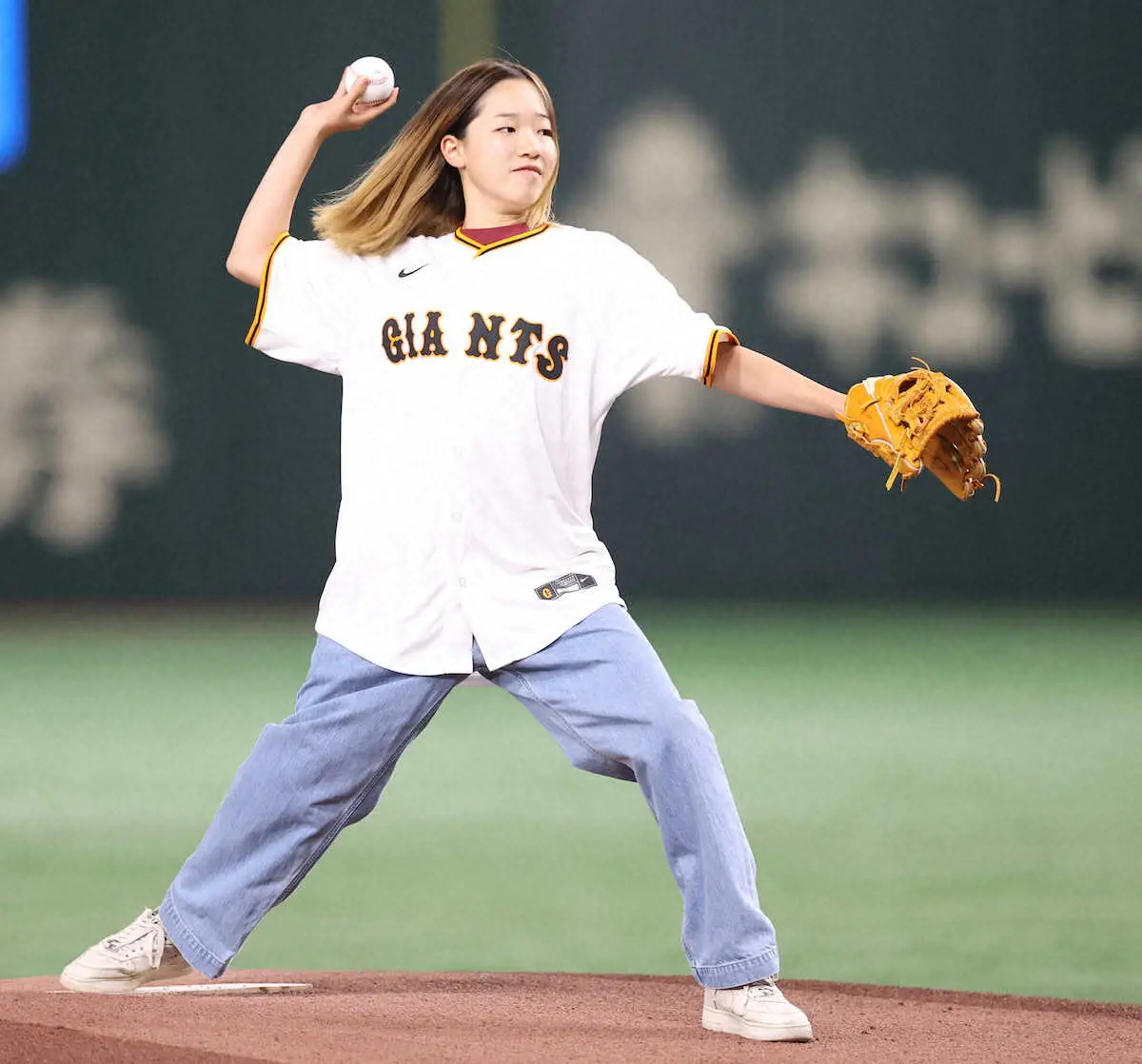 <巨・神>始球式を務めた吉沢恋(撮影・須田 麻祐子)