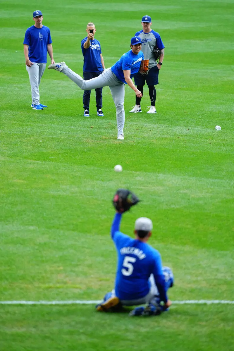 ドジャースの大谷翔平投手(30)が、14日(日本時間15日)のブルワーズ戦の前に投球練習を行った。
