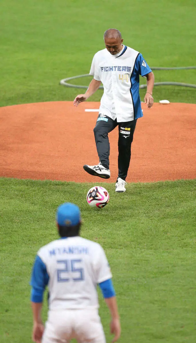 日本ハムのユニホームに背番号は「44」。マウンドの手前に立つと、セレモニアルピッチではなく、サッカーボールを置くと宮西尚生に向かっての優しい“セレモニアルキック”で盛り上げた。