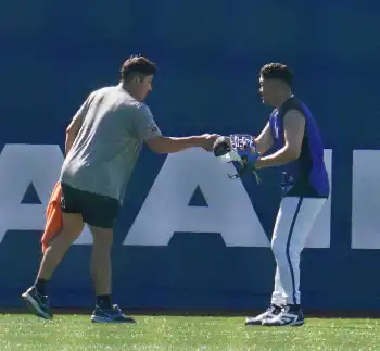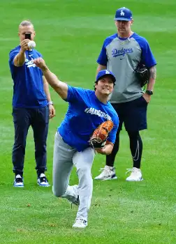 ドジャース・大谷翔平 キャッチボール中にヌートバーと再会 会話の途中で満面の笑み