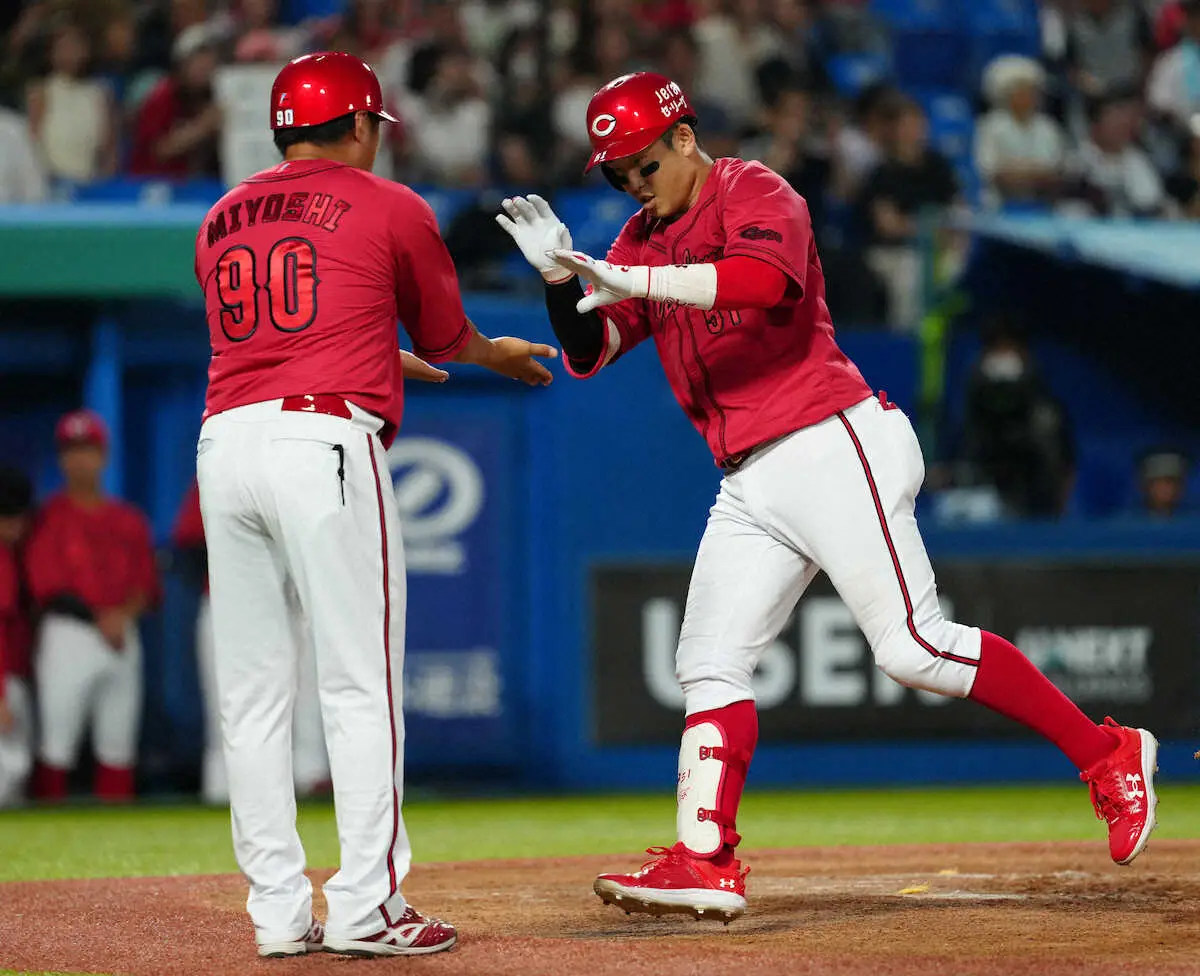 <ヤ・広>初回、先制3ランを放った坂倉(右)を祝福する新井監督(撮影・木村 揚輔) Photo by スポニチ 首位広島はヤクルトに大勝 がっちりとその座をキープ 九里は今季6勝目、… ギャラリーで見る この記事のフォト 2024年08月18日の画像一覧 もっと見る 2024年08月18日の画像をもっと見る