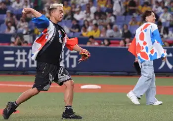 棚橋弘至 背番号「100」ユニで見事なノーバウンド投球「感無量」高校時代はサイドスロー球児