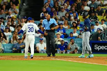 この後の4回の守りでは判定を巡って場内が騒然となる場面がった。1死二塁から右腕ビューラーが強打者ロドリゲスに対し、2ストライクから3球目のカーブを投じた。これは中継のストライクゾーン表示ではゾーンにかかる球だったが、球審はボール判定。これにビューラーが何やら言葉を発し始めると、デーブ・ロバーツ監督が慌ててベンチを飛び出して球審の元へ。ビューラーが退場にならないための行動だったのか、球審に抗議こそしたがすぐにベンチへ下がった。この判定を巡っては場内からはブーイングも飛んで騒然となる場面もあった。
