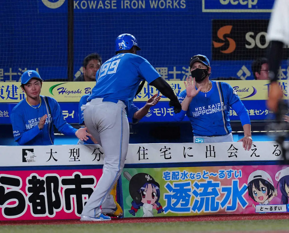 <ロ・日>5回、無死一塁、清宮の左中間タイムリーで生還した浅間を迎える新庄監督。左は佐々木(撮影・長久保 豊) Photo by スポニチ G.G.佐藤氏が感心する日本ハム・新庄監督の選手“操縦術”「新しいですよね… ギャラリーで見る この記事のフォト 2024年08月22日の画像一覧 もっと見る 2024年08月22日の画像をもっと見る