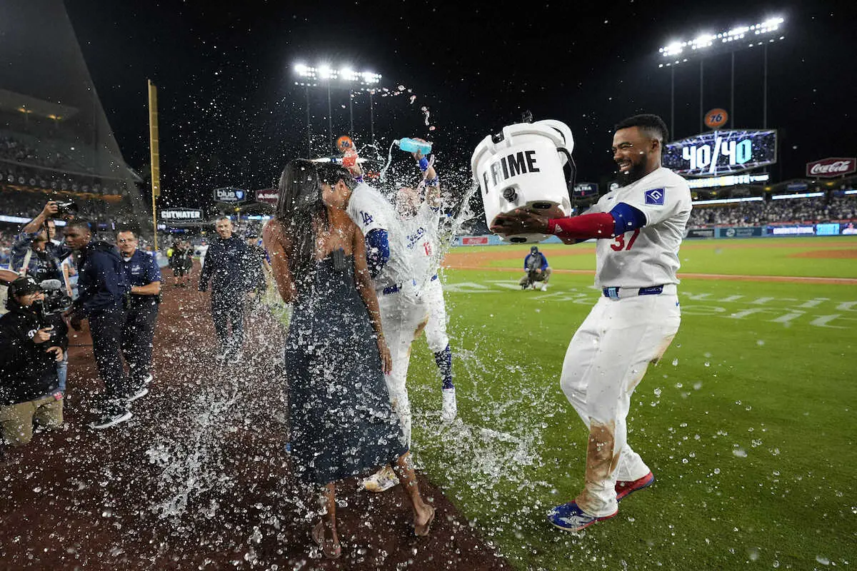 ヒーローインタビュー中にT・ヘルナンデスからウオーターシャワーの祝福を受け、リポーターのワトソンさん(手前)とともに水浸しになるドジャース・大谷(AP)