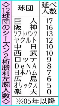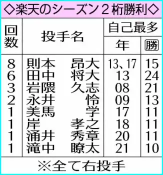 12球団のシーズン2桁勝利左腕人数 Photo by スポニチ 楽天・早川 球団左腕史上初の2桁勝利なるか?27日日本ハム戦に先発 ギャラリーで見る この記事のフォト 2024年08月27日の画像一覧 もっと見る 2024年08月27日の画像をもっと見る