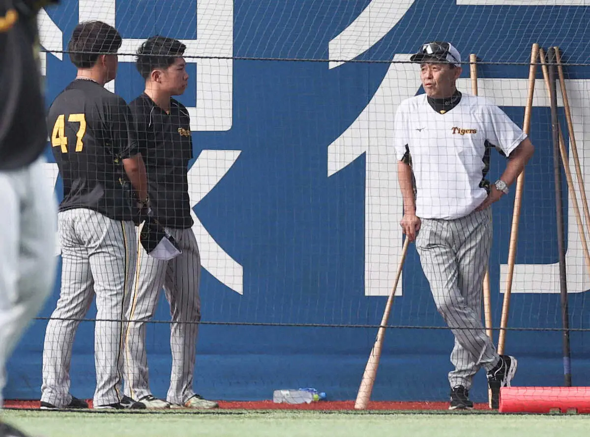 阪神・岡田彰布監督が、左右のリリーバー・石井大智投手(27)、桐敷拓馬投手(25)の2投手と、DeNA戦前に横浜スタジアムで行われた練習中に会話する場面が見られた。