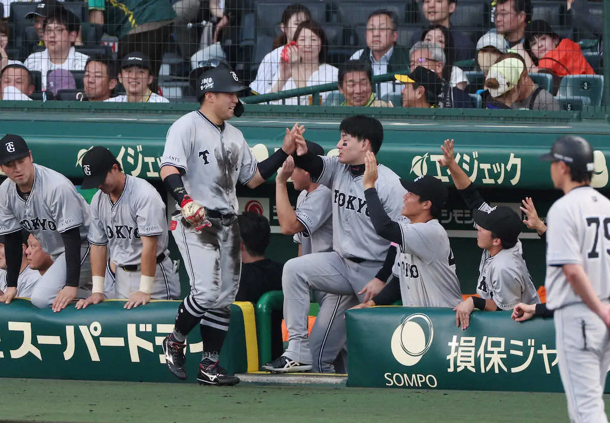 <神・巨22>初回1死二塁、生還した浅野(51)を笑顔で迎える阿部監督(左)(撮影・北條 貴史) Photo by スポニチ 巨人・浅野翔吾 逆転負けに悔しさあらわ “聖地”凱旋試合で二塁打も高校… ギャラリーで見る この記事のフォト 2024年08月31日の画像一覧 もっと見る 2024年08月31日の画像をもっと見る