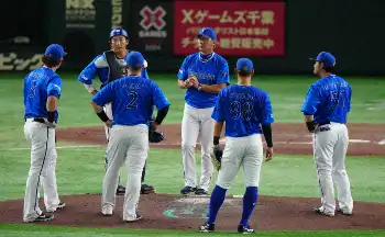 <巨・D19>3回、投手を交代し、マウンドで2番手投手を待つ三浦監督(中央)(撮影・木村 揚輔)