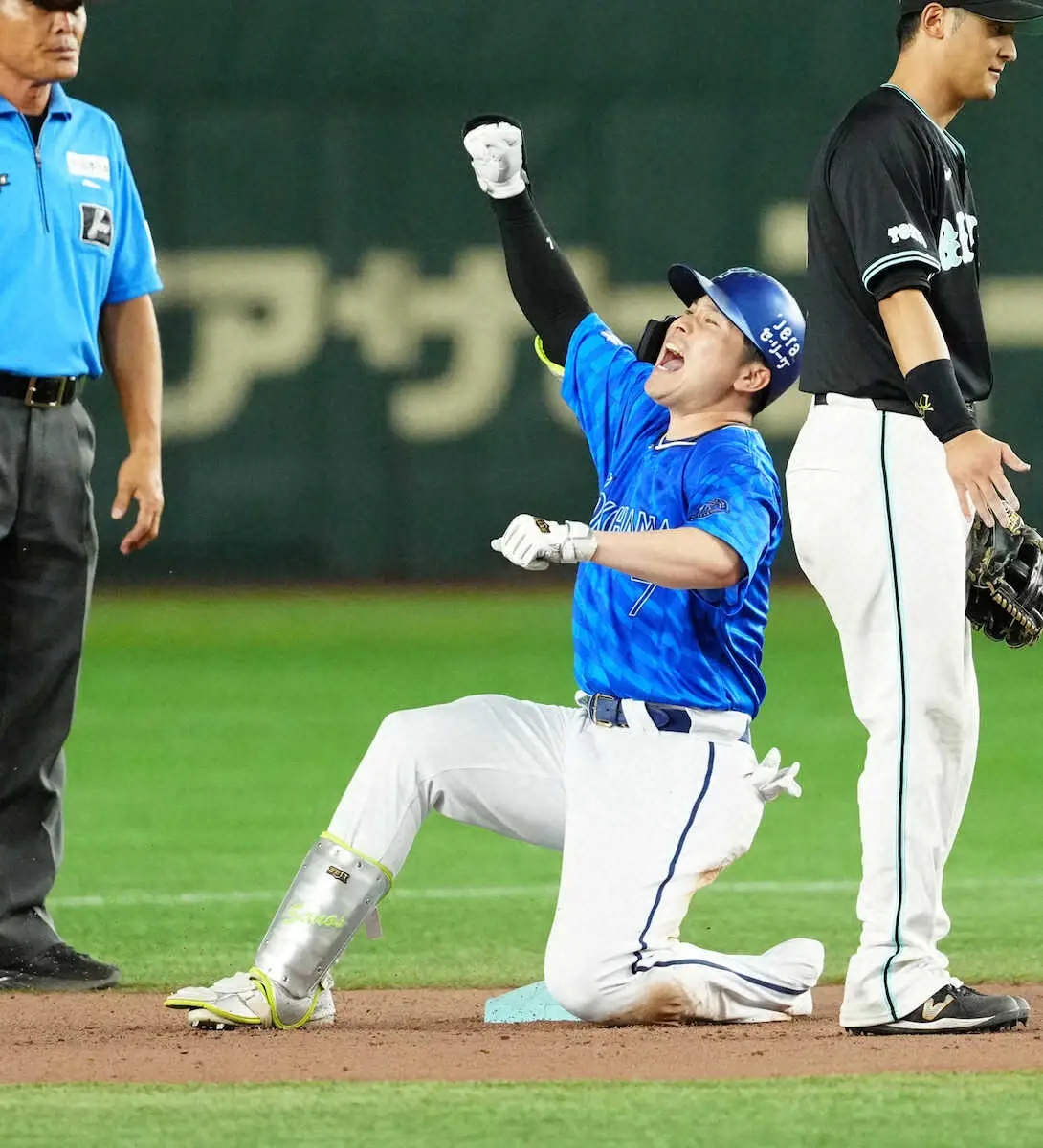 <巨・D19>8回、適時打を放ちガッツポーズの佐野(撮影・島崎忠彦)