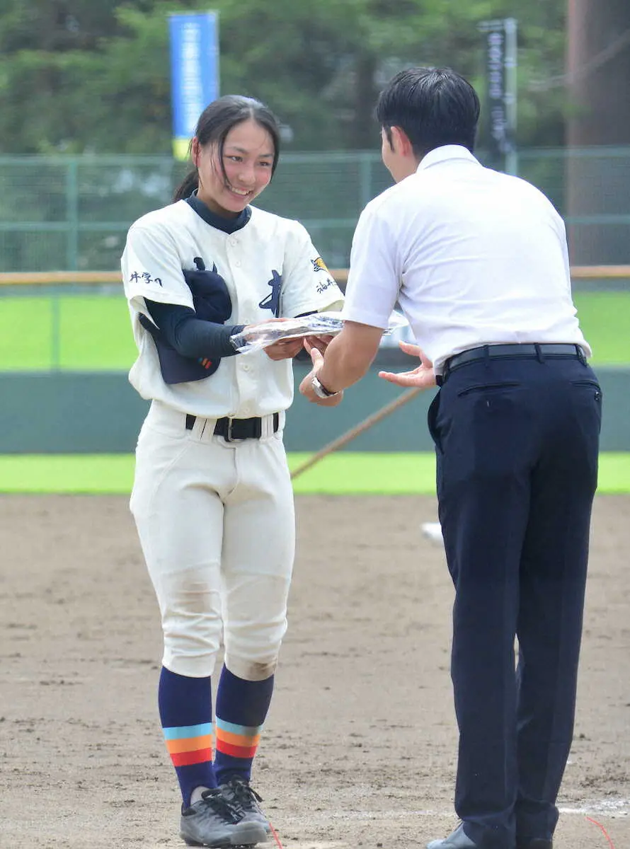 <横浜隼人―福井工大福井>1回戦のMVPに選出され記念品を受け取る丹下